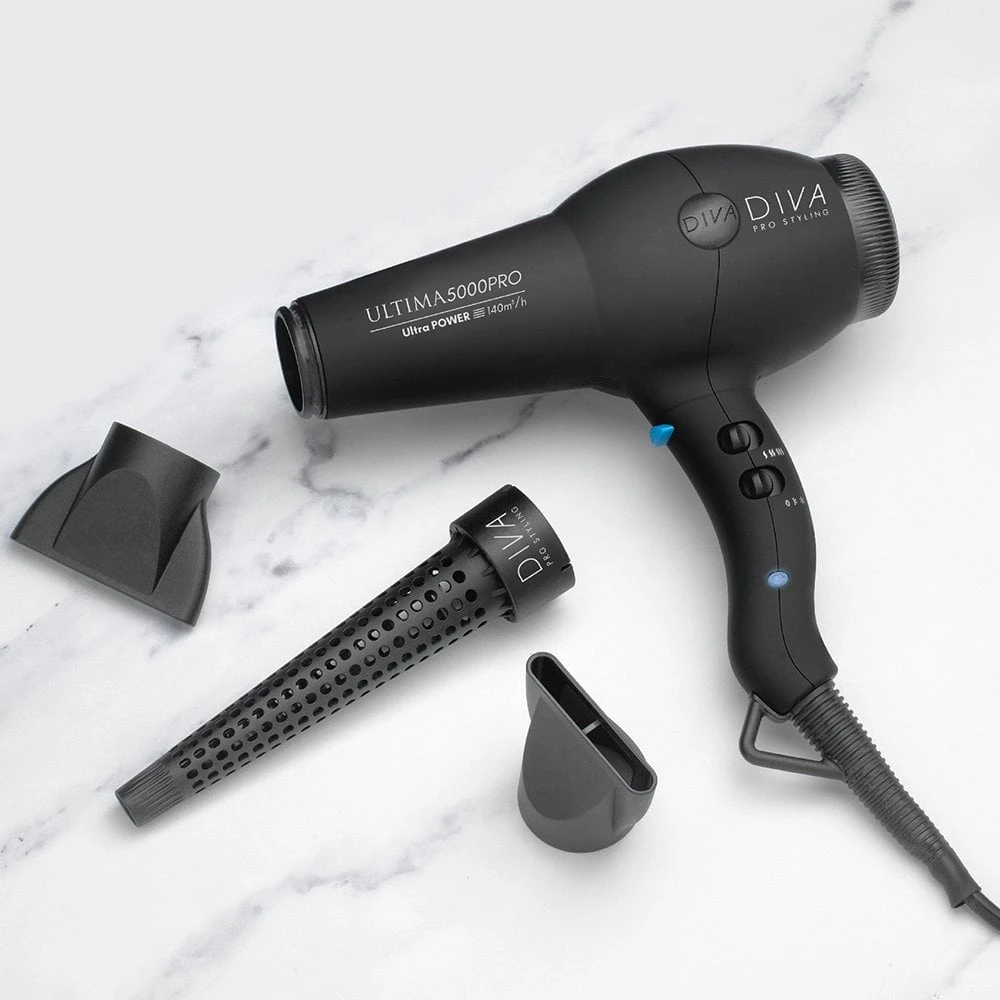 Diva Ultima 5000 Pro Hair Dryer Black is one of the most powerful hair dryers available. Featuring a high-pressure motor system that gives an unrivalled airflow of 77km/h airflow combined with a maximum temperature of 110C. Also includes a built-in ionic generator which is designed to enhance shine and eliminate frizz.