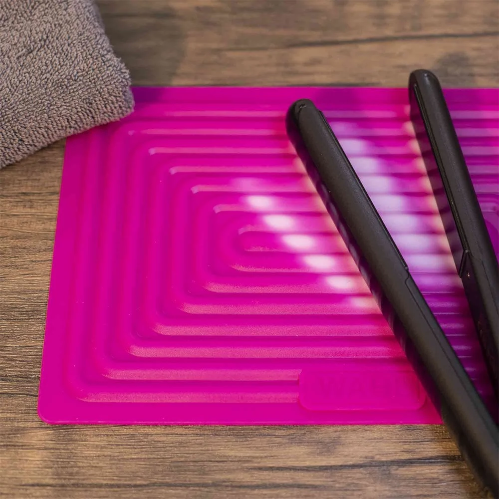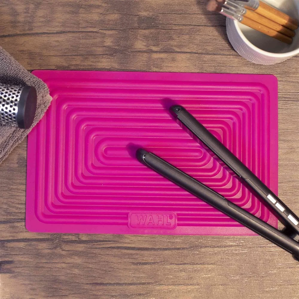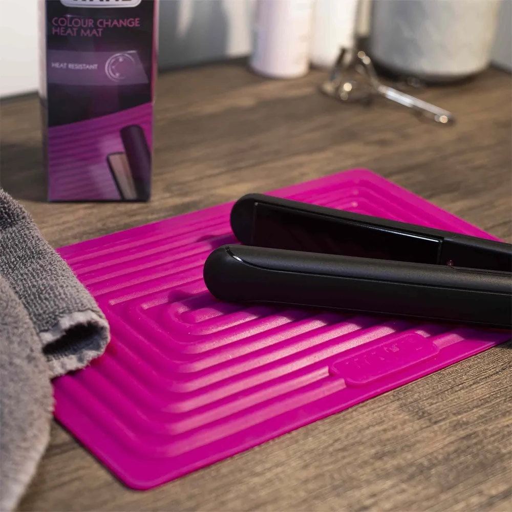 Wahl Colour Change Silicone Heat Mat Pink protects work surfaces from heated styling tools with heat resistance up to 300°C. It changes colour when in contact with your heated straighteners, tongs or wands, clearly indicating their current state and warns if they are too hot to touch.
